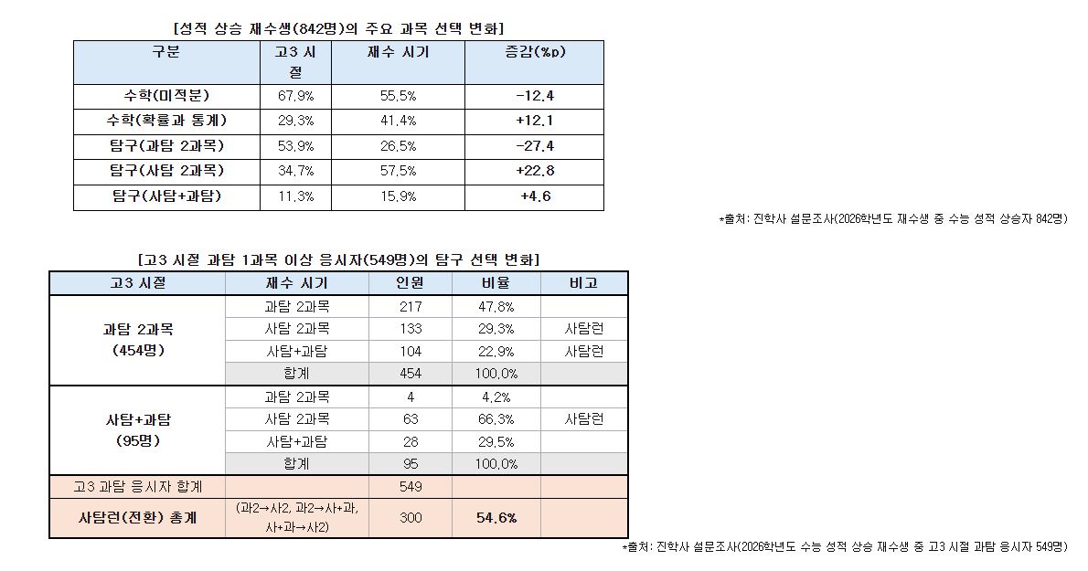 - 성적 상승 재수생 842명 분석 결과, 과탐 경험자 54.6%가 전략적 ‘사탐런’