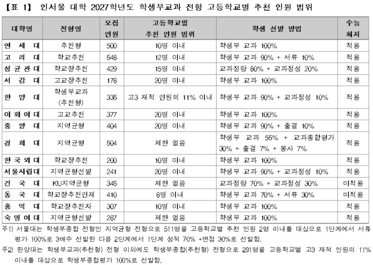 [유성룡의 입시포인트] 2027학년도 인서울 대학 수시 학생부교과전형 선발 방법
