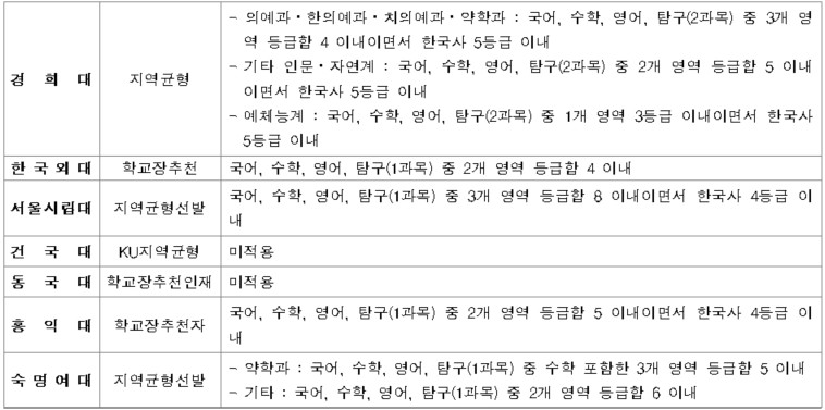 이 중 고려대는 2026학년도에 학생부 교과 성적 80% + 서류평가 20%로 선발했던 것을 학생부 교과 성적 90% + 서류평가 10% 선발로 변경하였다. 수능시험 최저 학력 기준은 건국대·동국대를 제외한 나머지 대학 모두에서 적용한다.