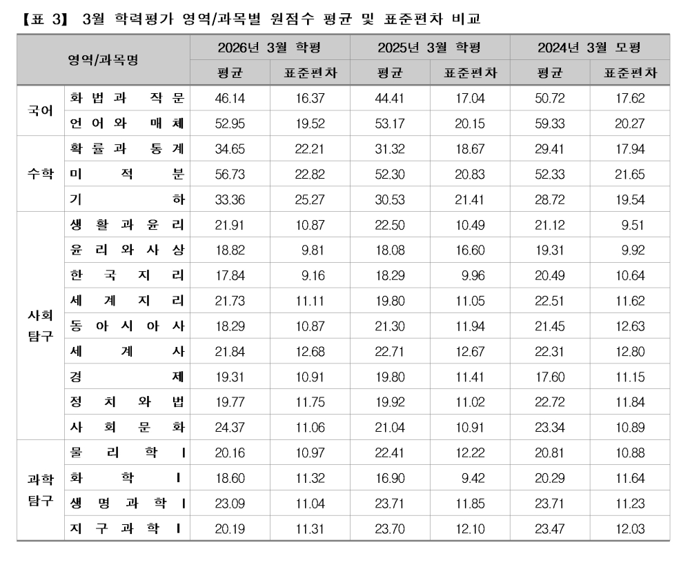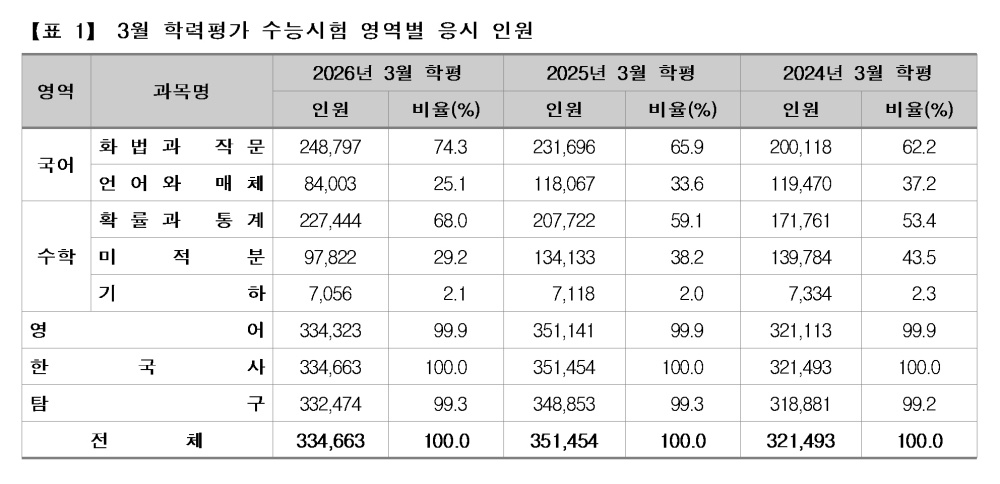 한편, 이번 3월 학평에서 국어 영역 화법과작문과 수학 영역 확률과통계 응시자가 크게 증가한 것은 2027학년도 수능시험이 현행 대학입시 제도에서 시행하는 마지막 시험이라는 점에 대한 부담으로 대비가 좀 더 수월한 과목으로 더 많이 응시한 결과 때문으로도 보인다.