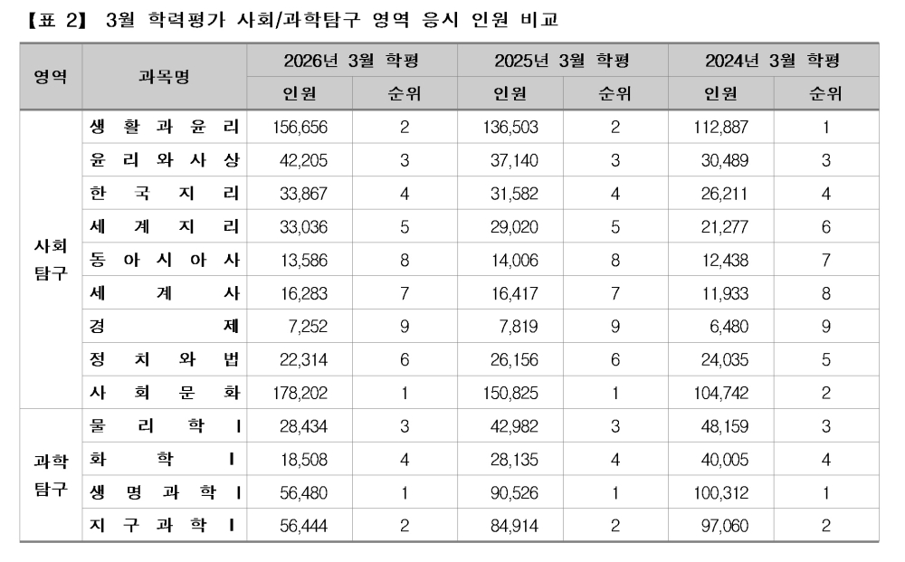 그런데 사회문화와 생명과학Ⅰ의 응시자 수를 탐구 영역 전체 응시자 대비 비율로 보면, 사회문화는 53.6%로 지난해 3월 학평에서 43.2%이었던 것보다 10.5%포인트 증가했지만, 생명과학Ⅰ은 17.0%로 지난해 3월 학평에서 25.9%이었던 것보다 8.9%포인트 감소한 것이 된다.