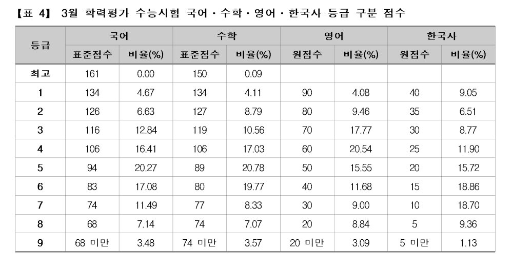 1등급의 경우에는 국어ㆍ수학 영역이 134점으로 동일했으나, 2등급에서는 수학 영역 127점, 국어 영역 126점으로 수학 영역이 1점 높은 점수를 보였다. 3등급도 수학 영역 119점, 국어 영역 116점으로 수학 영역이 3점 높은 점수를 보였다. 하지만, 4등급은 106점으로 동일했고, 5등급은 국어 영역 94점, 수학 영역 89점으로 국어 영역이 5점 높은 점수를 보였다.