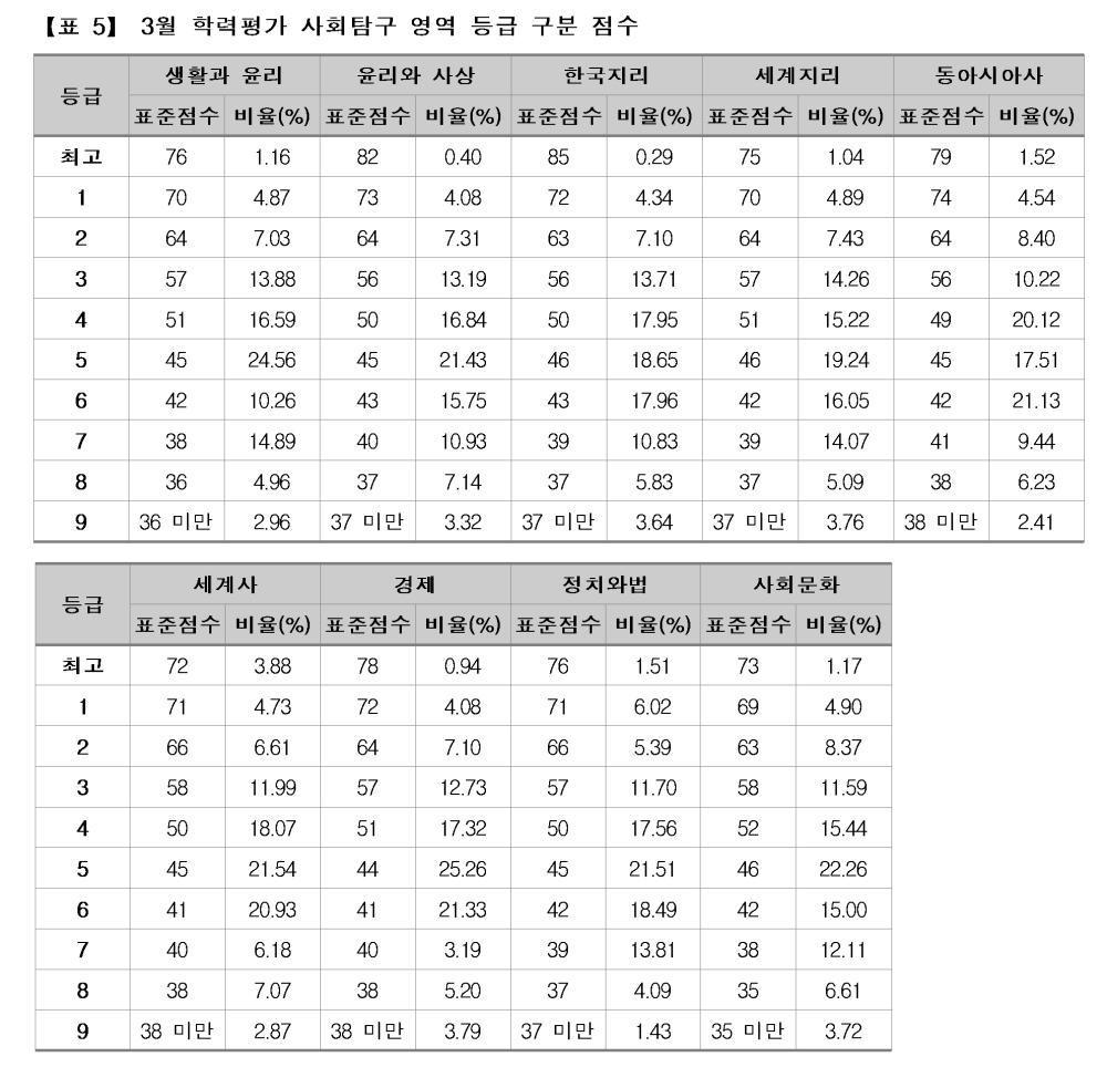 탐구 영역의 표준점수 최고점은 사회탐구의 경우 한국지리가 85점으로 가장 높았고, 이어 윤리와사상 82점, 동아시아사 79점, 경제 78점, 생활과윤리ㆍ정치와법 76점, 세계지리 75점, 사회문화 73점, 세계사 72점 순이었다. 이에 비해 1등급 구분 표준점수는 동아시아가 74점으로 가장 높았고, 그 뒤로 윤리와사상 73점, 한국지리ㆍ경제 72점, 세계사ㆍ정치와법 71점, 생활과윤리ㆍ세계지리 70점, 사회문화 69점 순이었다. 1등급과 2등급 간의 구분 표준점수 차는 동아시아사가 10점으로 가장 컸고, 이어 윤리와사상ㆍ한국지리 9점, 경제 8점, 생활과윤리ㆍ세계지리ㆍ사회문화 6점, 세계사ㆍ정치와법 6점 순이었다.