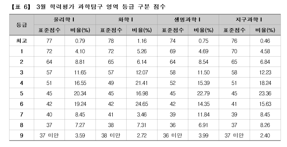 과학탐구의 경우 표준점수 최고점은 화학Ⅰ이 78점으로 가장 높았고, 이어 물리학Ⅰ 77점, 지구과학Ⅰ 76점, 생명과학Ⅰ 74점 순이었다. 1등급 구분 표준점수는 물리학Ⅰㆍ화학Ⅰ이 72점으로 가장 높았고, 이어 지구과학Ⅰ 70점, 생명과학Ⅰ 69점 순이었다. 1등급과 2등급 간의 구분 표준점수 차는 물리학Ⅰ이 8점이었고, 이어 화학Ⅰ 7점, 생명과학Ⅰㆍ지구과학Ⅰ 5점 순이었다.