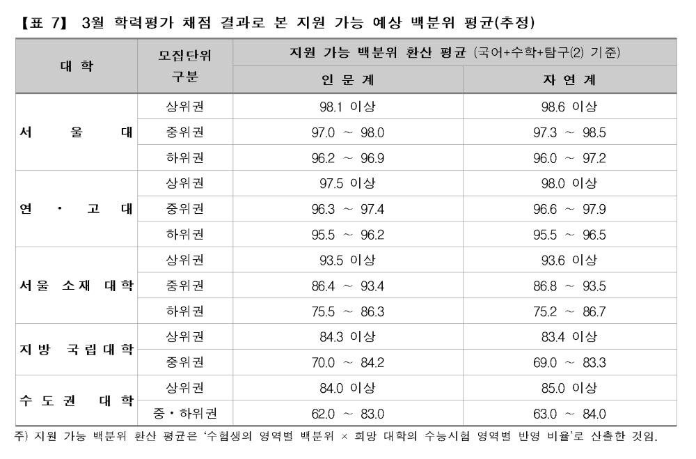 지난해 3월 학평에서는 ▲1등급 7.50%(2만6344명) ▲2등급 6.71%(2만3592명) ▲3등급 9.08%(3만1896명) ▲4등급 11.64%(4만926명) ▲5등급 14.86%(5만2231명) 등으로 5등급 이내가 49.79%를 차지했었다.