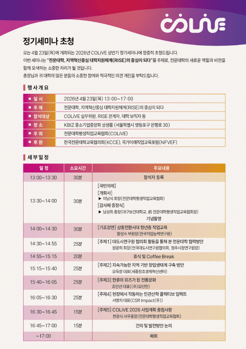COLiVE(회장 이남식 재능대학교 총장)는 오는 4월 23일 서울 영등포구 중소기업중앙회 상생룸에서 ‘COLiVE 2026년 상반기 정기세미나’를 개최한다고 밝혔다.