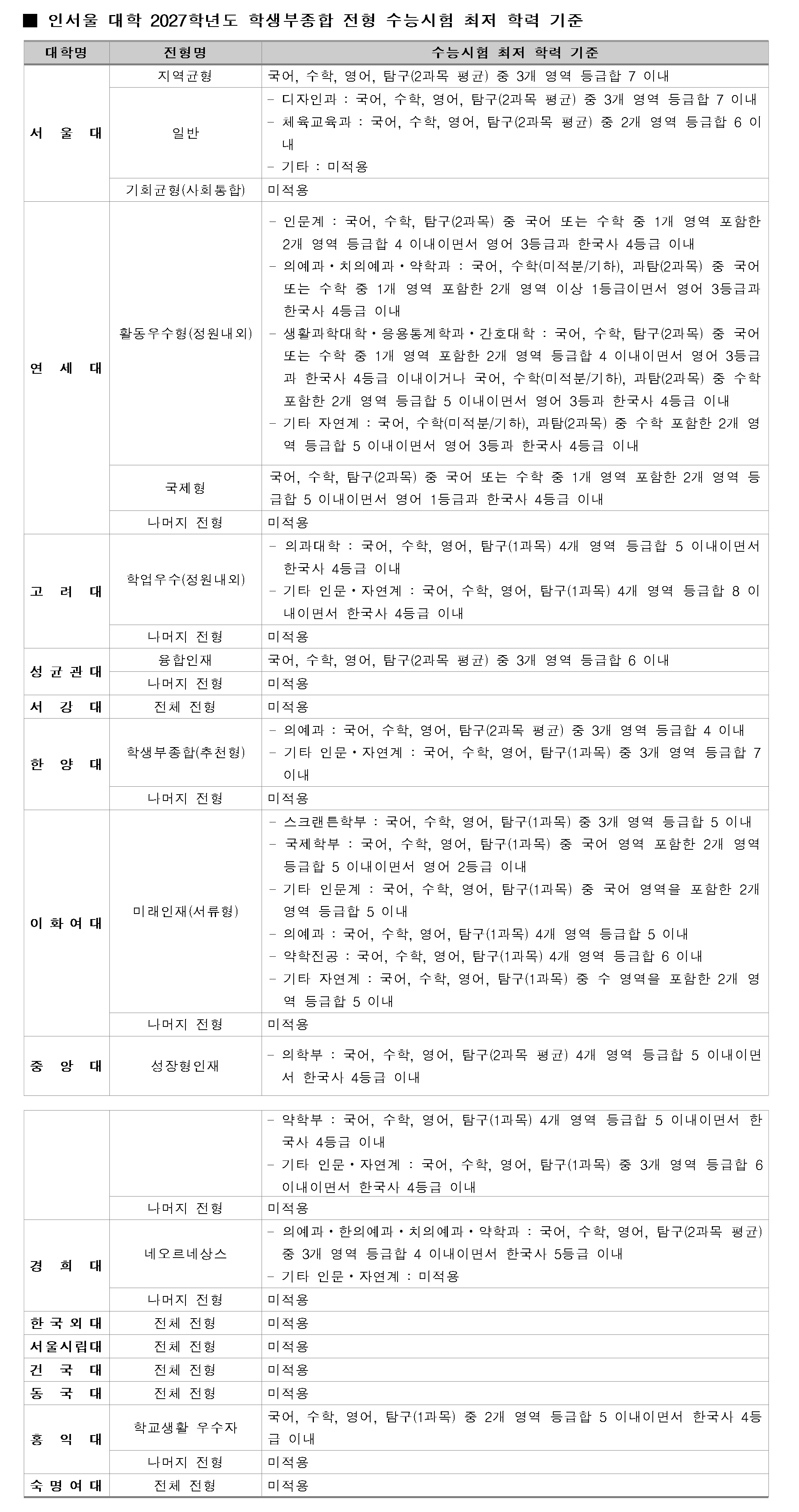 아울러 서울대ㆍ연세대ㆍ고려대ㆍ성균관대ㆍ한양대ㆍ이화여대ㆍ경희대ㆍ홍익대 등이 수능시험 성적을 최저 학력 기준으로 적용하기도 한다는 점도 고려하여 수능시험 대비에도 만전을 기할 필요가 있다. 인서울 대학의 2027학년도 수시 모집에서의 수능시험 최저 학력 기준은 아래 도표와 같다.