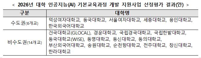 교육부와 한국대학교육협의회는 23일 ‘2026년 대학 인공지능(AI) 기본교육과정 개발 지원사업’ 선정평가 결과를 발표했다.