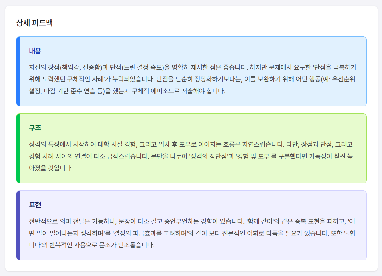 첨삭 피드백 역시 같은 방식으로 설계되었다. 영역별 점수와 함께 점수의 근거와 개선 방향이 구체적으로 제시되며, 글 전체를 아우르는 종합 피드백이 제공된다. 여기에 AI 활용 여부를 탐지하는 기능도 포함되어 있어, 학생이 실제로 작성한 글인지에 대한 참고 정보를 제공한다. 이는 단순한 부정행위 탐지를 넘어, 평가 결과를 해석하는 데 있어 신뢰도를 보완하는 장치로 기능한다.