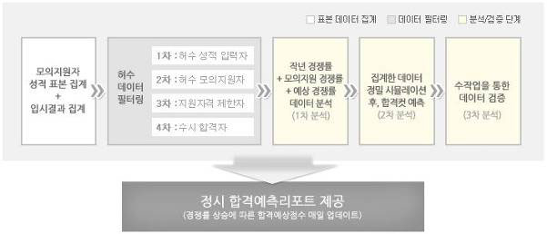 정확한 예측의 걸림돌이 되는 허수지원자를 세밀하게 걸러내기 위해 실제 원서접수로 이어지지 않는 모의지원자를 빈틈없이 걸러내는 허수지원 시스템을 구축하였다. 그 결과 지난해 합격예측은 적중률 71.5%를 기록했다.